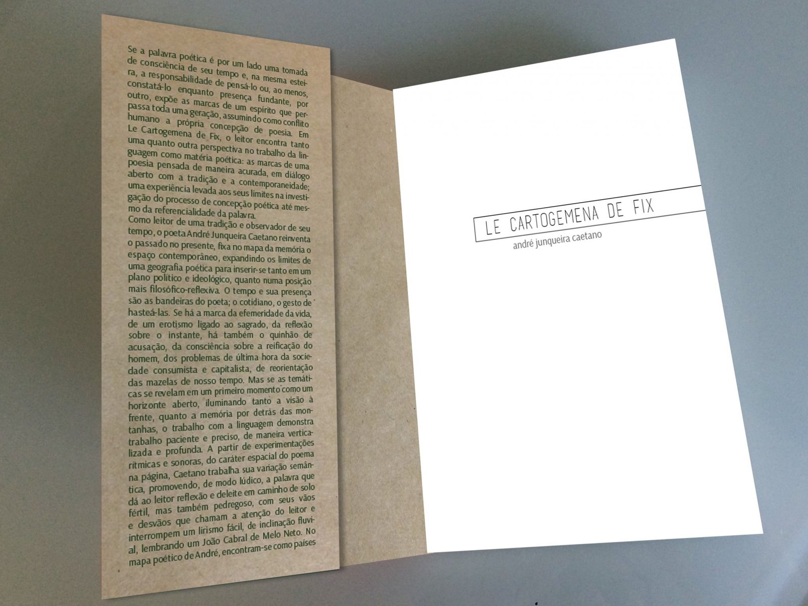 Como leitor de uma tradição e observador de seu tempo, o poeta André Junqueira Caetano reinventa o passado no presente, fixa no mapa da memória o espaço contemporâneo e expande os limites de uma geografia poética. No livro, o tempo e sua presença são as bandeiras do poeta; o cotidiano, o gesto de hasteá-las. A partir de experimentações rítmicas e sonoras, do caráter espacial do poema na página, Caetano trabalha sua variação semântica, promovendo, de modo lúdico, a palavra que dá ao leitor reflexão e deleite em caminho de solo fértil, mas também pedregoso, com seus vãos e desvãos que chamam a atenção do leitor e interrompem um lirismo fácil, de inclinação fluvial, lembrando um João Cabral de Melo Neto. Nos versos de Le Cartogemena de Fix, a poesia se dá ininterrupta e pacientemente ao leitor, como em movimento crescente das tensões do discurso, do vocábulo, do léxico, de uma quase invenção linguística, contra uma fórmula conhecida e repetitiva da poesia. Em uma visão política da linguagem, na disputa pela linguagem, “a gente tem que reentender a própria língua” e a poesia se coloca precisamente como um contraponto. Enfim, André Junqueira Caetano nos apresenta a poesia de quem se encontra atento à criação do mundo como linguagem e pela linguagem, em constante trânsito e transformação, ou como muito bem diz o poeta: “toda poesia é pênsil”